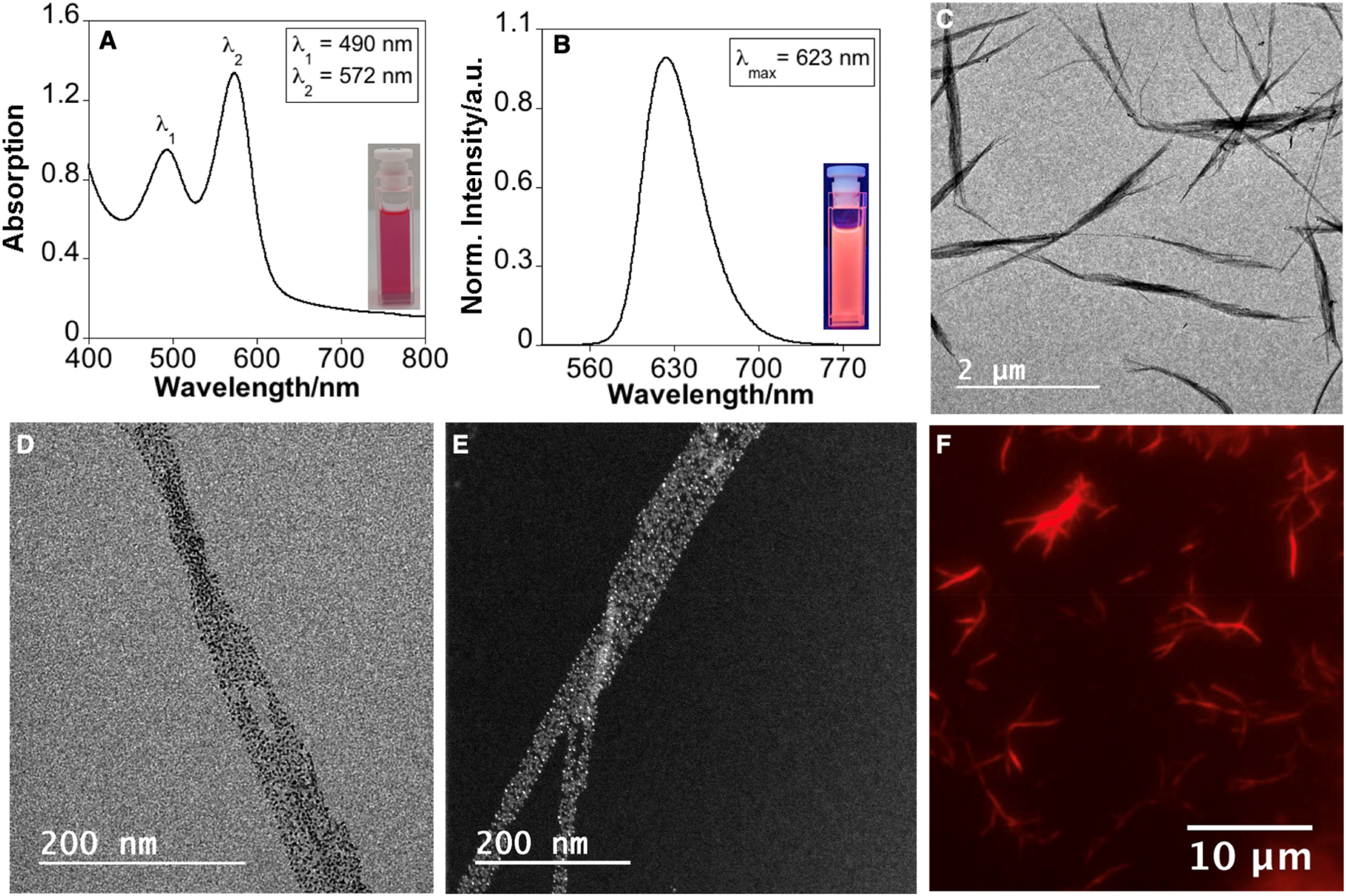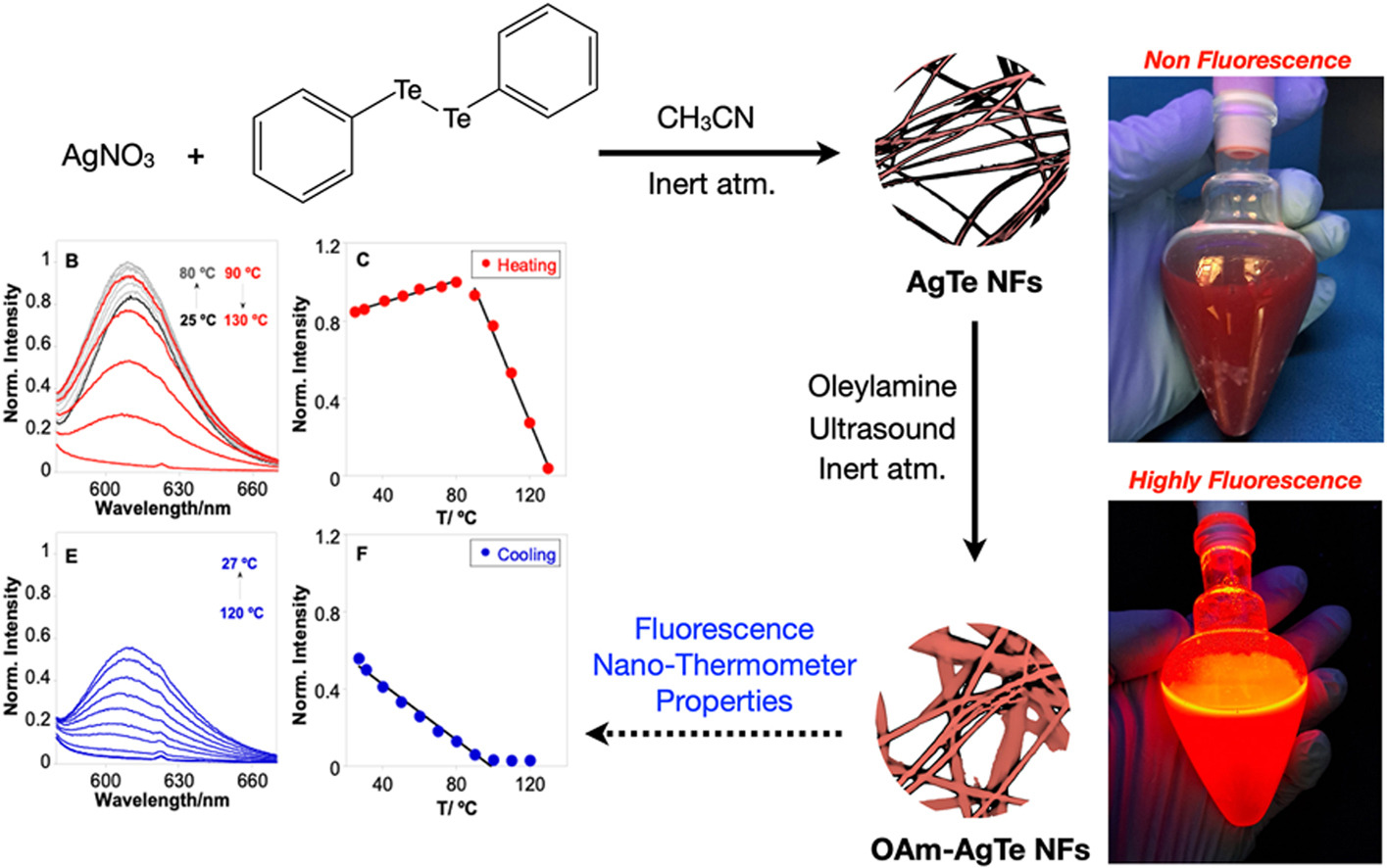 Silver-Telluride 2D organometallic nanofibers (NFs), using diphenyl ditelluride (DPDT) as a precursor, were synthesized. The synthesis was carried out by reacting DPDT with silver nitrate in acetonitrile at room temperature (RT) under an inert atmosphere. The resulting material was fully characterized using various techniques, including UV-VIS-NIR spectroscopy, steady-state and excited-state fluorescence spectroscopy, IR-FTIR-ATR spectroscopy, HR-ESI MS spectrometry, high-resolution transmission electron microscopy (HRTEM), BF-STEM or HAADF-STEM, confocal fluorescence microscopy images and conductivity measurements. Initially, the nanofibers were almost non-emissive. However, a remarkable modification was observed after treating the nanofibers with oleylamine under ultrasound treatment. This methodology induced an aggregation emission effect (AIE) in the solution and in the solid state, resulting in the formation of a highly red emissive fluorescent nanomaterial. This research provides valuable insights for developing new fluorescent materials with potential applications in various optical fields. Dyes and Pigments, 2023, 220, 111754.
